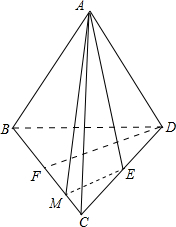 3.在棱长都相等的四面体ABCD中,E、F分别是CD、BC的中点,则异面直线AE、DF所成角的余弦值是$\frac{1}{6}$.分析 画出四面体ABCD,并设BC=4,取CF的中点为M,则∠AEM或其补角便是异面直线AE、DF所成角,这时候可以求出CM,CE,ME,而由余弦定理可以求出AM,从而在△AEM中由余弦定理即可求出cos∠AEM,这便得到异面直线AE、DF所成角的余弦值.