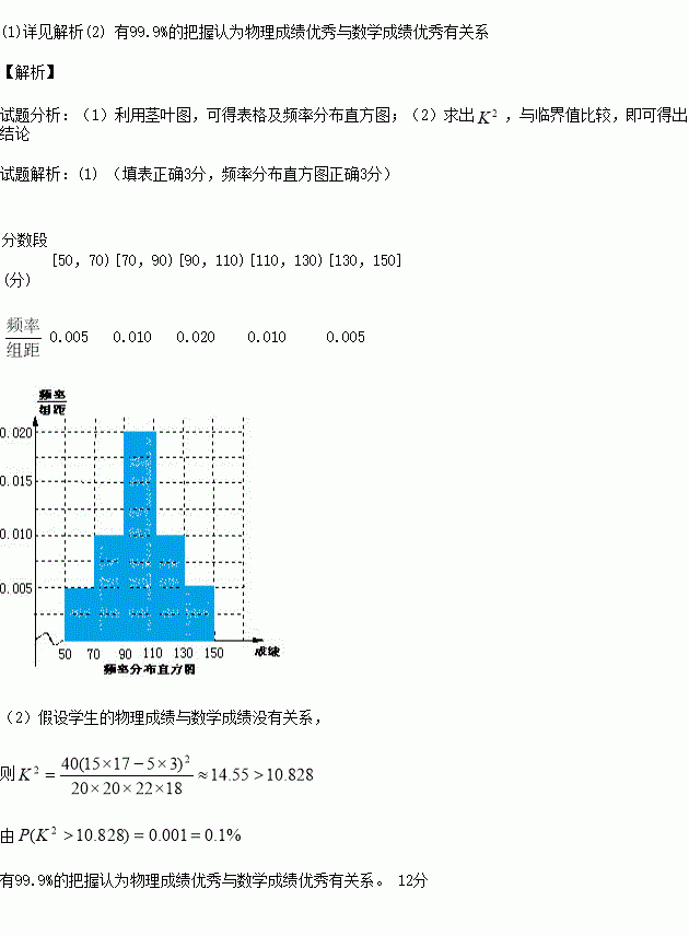 (2)为考察学生的物理成绩与数学成绩是否有关系,抽取了部分同学的数学成绩与物理成绩进行比较,得到统计数据如下: