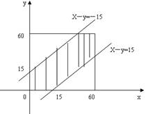 解:设x和y为下午4;00以后甲.乙俩人分别到达约定地点的时间(以分钟计数),则他们所有可能的到达时间都可由有序数对(x,y)来表示,这里0<x<60,0<y<60,基本事件组所对应的几何区域即边长为60的正方形区域(如图),为使得甲.乙俩人相遇他们到达的时间必须在相距15分钟的间隔之内,用数学符号表示即为绝对值不等式x-y<15,而基本事件组所对应的几何区域中x-y<15的图形构成事件r发生的区域,事件r的阴影部分和R的区域如图所示。