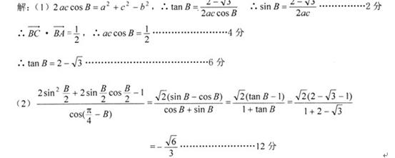 (本小题满分12分)已知△ABC中,角A,B,C对边分别是a,b,c,且tanB=,·.(1)求tanB的值;(2)求的值.