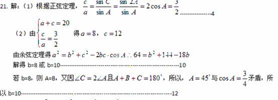 在中,,,的对边分别为a,b,c。若a+c=20,,