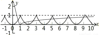 【答案】分析:函数f(x)是以2为周期的周期函数,又由x∈(-1,1]时,f(x)=1-x2,函数g(x)=lg|x|,在同一坐标系中,作出它们的图象,由图象上看交点个数.