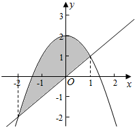 解答 解:由曲线y=2-x2与直线y=x所围成的图形如图,面积为${∫}_{-2}^{1}(2-{x}^{2}-x)dx$=(2x-$\frac{1}{3}{x}^{3}-\frac{1}{2}{x}^{2}$)|${\;}_{-2}^{1}$=$\frac{9}{2}$.![]()