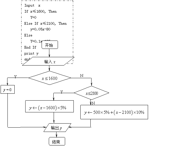 (14分)修订后的《个人所得税法》规定:个人所得税的起征点为1600元,即收入不超过1600元,免于征税;超过1600元的按以下税率纳税:超过部分在500元以内(含500元),税率为5%,超过500元至2000元的部分,税率为10%.已知某厂工人的最高收入不高于3500元,写出分段函数并用流程图以及算法语句描述一个算法,对输入的个人收入,计算其所得税.