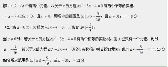 (12分)已知集合,(1)若中有两个元素,求实数的取值范围;(2)若中至多有一个元素,求实数的取值范围.