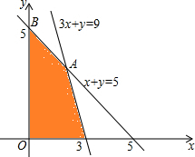 12.已知x,y满足不等式组,则$\left\{\begin{array}{l}{x≥0}\\{y≥0}\\{x+y≤5}\\{3x+y≤9}\end{array}\right.$,则x+2y的最大值是( )| A. | 3 | B. | 7 | C. | 8 | D. | 10 |