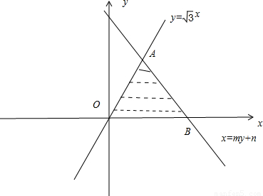 【答案】分析:令直线l:x=my+n(n>0)与x轴交于B点,则得可行域是三角形OAB,根据正弦定理可构造一个关于n的方程,解方程即可求出实数n的值