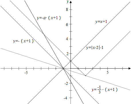当-a=-$\frac{1}{3}$,即a=$\frac{1}{3}$时,函数y=|x-2|-1与y=-a(x+1)的图象有一个交点,