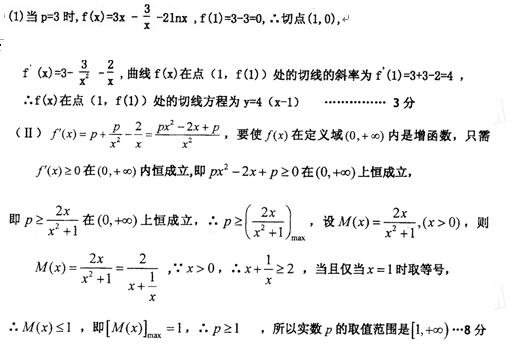 已知函数(1)若P=3,求曲线在点(1,)处的切线方程;(2)若P>0且函数在其定义域内为增函数,求实数P的取值范围;(3)若函数存在极值,求实数P的取值范围。