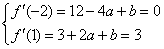 已知函数f(x)=x3+ax2+bx+5,若x=-2时,f(x)有极值,且曲线y=f(x)在点x=1处的切线斜率为3,