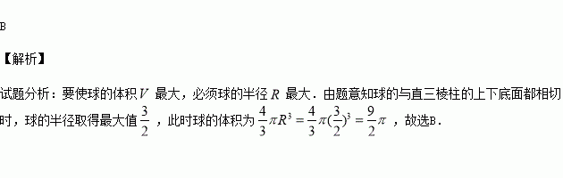 在封闭的直三棱柱内有一个体积为V的球,若,,,,则V的最大值是