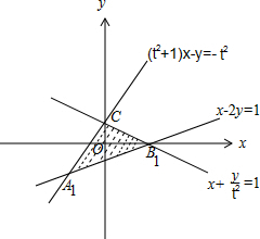 解答 解:由约束条件$\left\{\begin{array}{l}{x+\frac{y}{{t}^{2}}≤1}\\{({t}^{2}+1)x-y≥-{t}^{2}}\\{x-2y≤1}\end{array}\right.$作出可行域如图,![]()