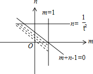 ∴$\left\{\begin{array}{l}{m-1≤0}\\{{t}^{2}n-1≤0}\\{m+n-1≤0}\end{array}\right.$,作出可行域如图,![]()
