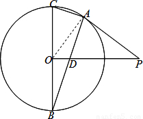 如图,已知PA与圆O相切于点A,直径BC⊥OP,连接AB交PO于点D
