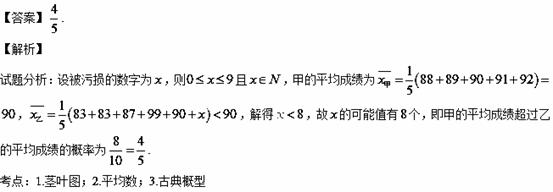 次综合测评中的成绩的茎叶图,其中一个数字被污损;则甲的平均成绩超过乙的平均成绩的概率为 .