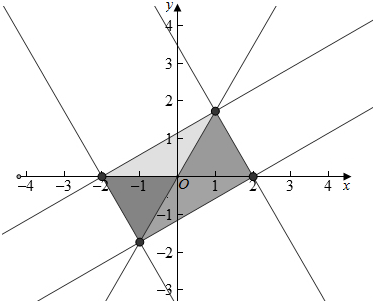即$\left\{\begin{array}{l}{y≤\sqrt{3}x}\\{y≥0}\\{y≤-\sqrt{3}x+2\sqrt{3}}\end{array}\right.$或$\left\{\begin{array}{l}{y≤\sqrt{3}x}\\{y≤0}\\{y≥\frac{\sqrt{3}}{3}x-\frac{2\sqrt{3}}{3}}\end{array}\right.$或$\left\{\begin{array}{l}{y≥\sqrt{3}x}\\{y≥0}\\{y≤\frac{\sqrt{3}}{3}x+\frac{2\sqrt{3}}{3}}\end{array}\right.$或$\left\{\begin{array}{l}{y≥\sqrt{3}x}\\{y≤0}\\{y≥-\sqrt{3}x-2\sqrt{3}}\end{array}\right.$,