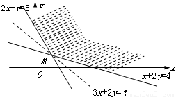 过直线2x+y=5和直线x+2y=4的交点(2,1),∴最优解为:x=2,y=1…(10分)