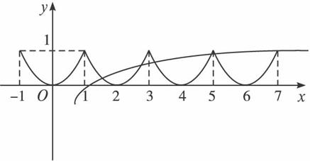 已知函数y=f(x)(x∈R)满足f(x+2)=f(x),且当x∈[-1,1],时f(x)=x2,则y=f(x)与y=log7x的图象的交点个数为A.3 B.4 C.5 D.6