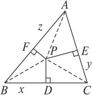 解:设BC=a,CA=b,AB=c,BD=x,CE=y,AF=z,如图,连结PA、PB、PC.