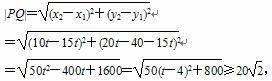 ∴当且仅当t=4时,|PQ|取得最小值20