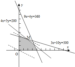 依题意可得:$\left\{\begin{array}{l}3x+10y≤300\\ 9x+4y≤360\\ 4x+5y≤200\\ x≥0,y≥0\end{array}\right.$,