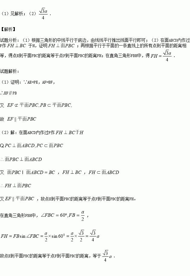 如图,在边长为a的菱形ABCD中,,E,F分别是PA和AB的中点。