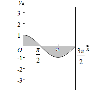 则对应的面积为${∫}_{0}^{\frac{3π}{2}}|cosx|dx$=3${∫}_{0}^{\frac{π}{2}}cosdx$=3×sinx${|}_{0}^{\frac{π}{2}}$=3,