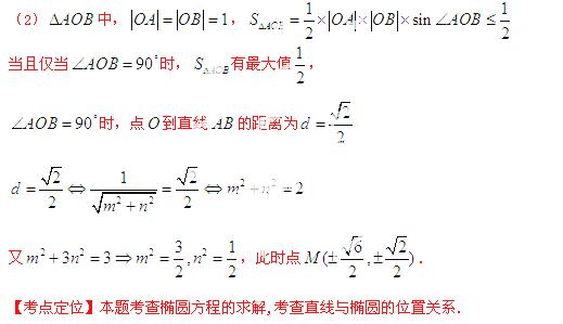 (2)在椭圆C上,是否存在点M(m,n)使得直线l:mx+ny=1与圆O:x2+y2=1相交于不同的两点A、B,且△OAB的面积最大?若存在,求出点M的坐标及相对应的△OAB的面积;若不存在,请说明理由。