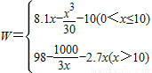 (2)①当0<x<10时,由W'=8.1-