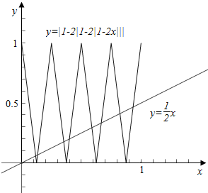 6.已知f(x)=|1-2x|,x∈[0,1],那么方程f(f(f(x)))=$\frac{1}{2}$x的解的个数是8.分析 化简f(f(f(x)))=|1-2|1-2|1-2x|||,作函数y=f(f(f(x)))与函数y=$\frac{1}{2}$x的图象,从而确定答案.