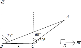 (2013•红桥区二模)一海轮在B处望见A处的小岛,测得小岛在海轮北偏东75°,海轮由B处向正东方向行驶8n mile到达C处,测得此时小岛在海轮北偏东60°.这艘海轮不改变方向继续前行,则海轮与小岛的最近距离为