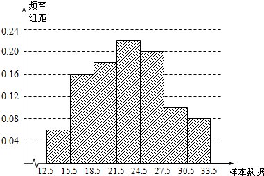 解答 解:(1)计算极差为33-13=20,确定组数为7,组距为$\frac{20}{7}$≈3,