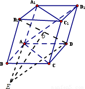 【答案】分析:根据平行六面体ABCD-A1B1C1D1中,三棱锥B1-ABC为正四面体,可得该几何体各棱及每个面的较短的对角线均相等,进而由正四面体的几何特征还可得到四棱锥B1-ACC1A1和四棱锥D-ACC1A1均为正四棱锥,连接B1D交平面ACC1A1于O,延长A1A至E,使A1A=AE,连接AD1,DE,可得∠OED即为直线AD1与平面ACC1A1所成角,解△OED可得答案.