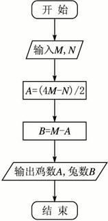一群小兔一群鸡,两群合到一群里,要数腿共N条,要数脑袋整M个,画出程序框图并编写程序求有多少小兔、多少小鸡?
