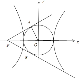 17.已知双曲线Γ:$\frac{x^2}{a^2}$-$\frac{y^2}{b^2}$=1(a>0,b>0)的离心率为2,过双曲线Γ的左焦点F作圆O:x2+y2=a2的两条切线,切点分别为A、B,则∠AFB=60°.分析 利用双曲线的离心率,结合圆的切线与x轴的关系,推出∠AFB的大小即可.
