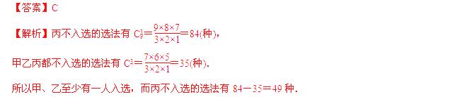 从10名大学毕业生中选3个担任村长助理,则甲、乙至少有1人入选,而丙没有入选的不同选法的种数为 ( )