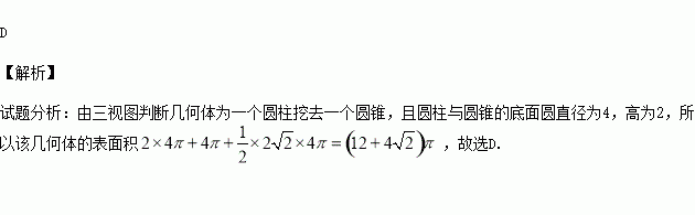 某几何体的三视图如图所示,其中俯视图中圆的直径为4,该几何体的表面积为( )