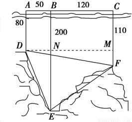 如图,为了解某海域海底构造,在海平面内一条直线上的A、B、C三点进行测量.已知AB=50 m,BC=120 m,于A处测得水深AD=80 m,于B处测得水深BE=200 m,于C处测得水深CF=110 m,求∠DEF的余弦值.