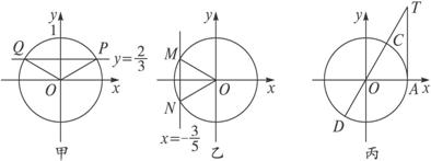 (3)在直线x=1上截取AT=2,其中A的坐标为(1,0),设直线OT与单位圆交于C,D,则OC与OD为角α的终边,如图丙.