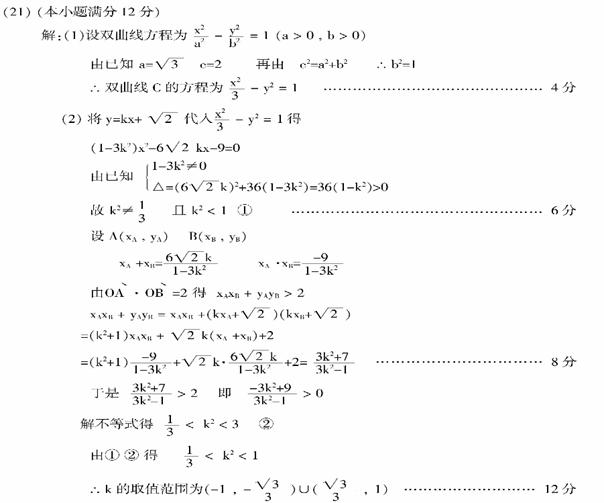 (2)若直线与双曲线C恒有两个不同的交点A和B,且(其中O为原点),求k的取值范围。
