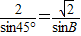 点评:本题给出三角形的两条边和其中一边的对角,求另一条边的对角,着重考查了利用正弦定理解三角形和三角形中大边对大角等知识,属于基础师.