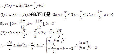 (12分)函数(1)写出的单减区间;(2)设最小值为-2,最大值为,求a,b的值。[来源:学&科&网]