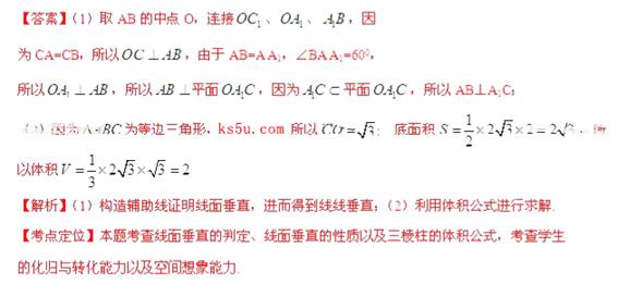 如图,三棱柱中,侧面底面,,且,O为中点.