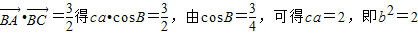 由余弦定理:b2=a2+c2-2ac•cosB,又b2=ac=2,cosB=