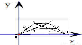 【答案】分析:以BC所在直线为x轴,B为原点建立如图直角坐标系,可得A、B、C、D各点的坐标.利用梯形的中位线定理,结合题中数据算出G(