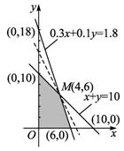 作直线l0:x+0.5y=0,并作平行于直线l0的一组直线x+0.5y=z,z∈R,与可行域相交,其中有一条直线经过可行域上的M点,且与直线l0:x+0.5y=0的距离最大,这里M点是直线x+y=10和直线0.3x+0.1y=1.8的交点.