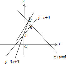 联立$\left\{\begin{array}{l}{y=3x+3}\\{x+y=6}\end{array}\right.$,解得C($\frac{3}{4},\frac{21}{4}$),