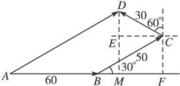 某人从点A向东位移60 m到达点B,又从点B向东偏北30°方向位移50 m到达点C,又从点C向北偏西60°方向位移30 m到达点D,选用适当的比例尺作图,求点D相对于点A的位置.