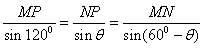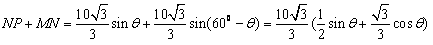 | (2)在△MNP中,∠MNP=120°,MP=5,设∠PMN=θ, 则0°<θ<60° 由正弦定理得 ∴ ∴ 故 ∵0°<θ<60°, ∴当θ=30°时,折线段赛道MNP最长 亦即,将∠PMN设计为30°时,折线段道MNP最长。 |