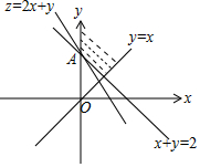 解答 解:由约束条件$\left\{\begin{array}{l}x≥0\\ x≤y\\ x+y≥2\end{array}\right.$作出可行域如图,![]()